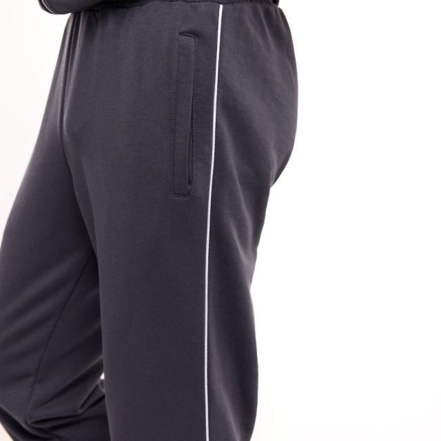 Штани прямого крою з еластичним поясом на резинці та додатковим шнурком для регулювання. Дві бокові кишені роблять їх зручними у повсякденному використанні, а контрастний кант уздовж швів візуально витягує силует і підкреслює дизайн костюма.