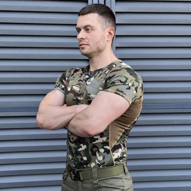 Дизайн футболки відображає два стилі: спортивний та мілітарі. Приталений крій підкреслює фігуру, даруючи впевненість і комфорт під час руху.