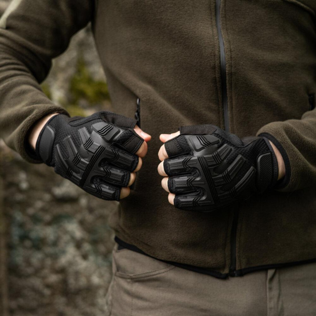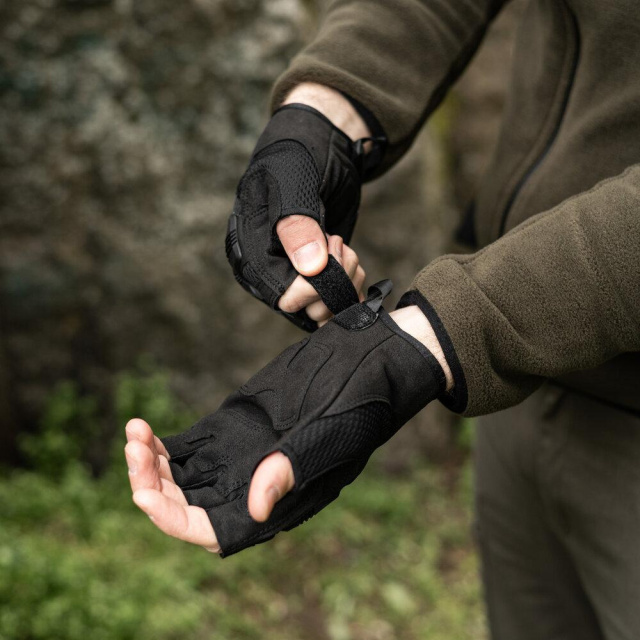 Легкі, зручні та зносостійкі тактичні рукавиці. Матеріали: штучна шкіра, спереду вставки з дихаючого матеріалу. TPR гума захищає найбільш уразливі місця. На зап'ясті регулюються за допомогою липучки. Є петля для кріплення за допомогою карабіну. Спеціальні ущільнювальні вставки на долонях підвищують зносостійкість в місцях найбільшого механічного тертя. Розміри: M L XL.
